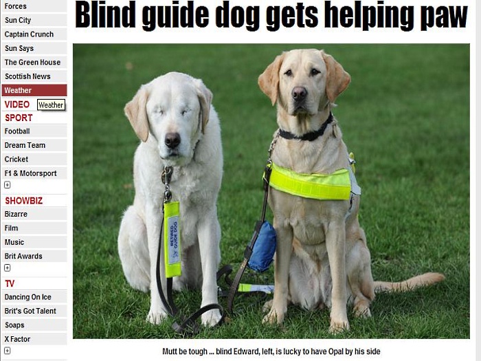 Edward, um cão da raça labrador de oito anos, passou de cão-guia a "cliente" de um de seus colegas. O animal, que vive na Inglaterra, perdeu a visão dos dois olhos após passar por uma cirurgia de catarata.